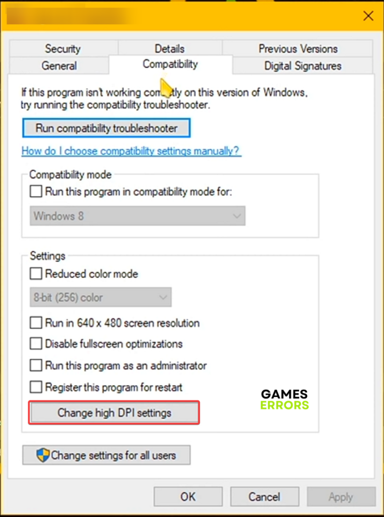 5. Kattintson aKompatibilitásfül, majd kattintson a gombraVáltoztassa meg a magas DPI -beállításokat-