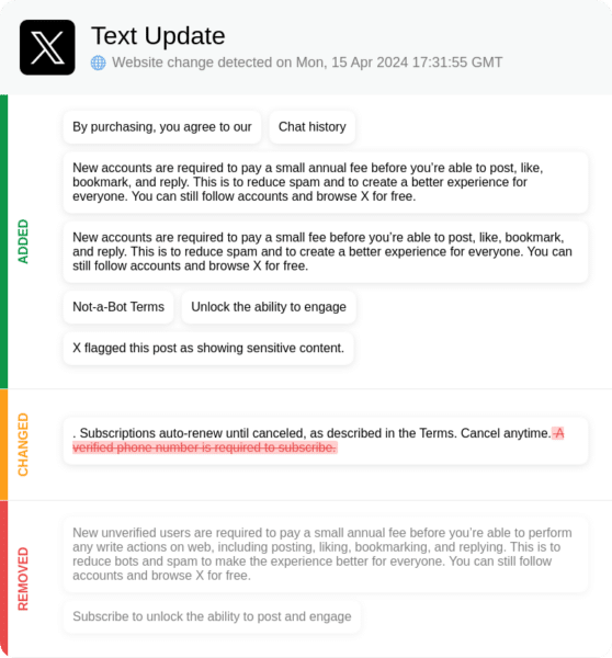 A házirend-módosítással kapcsolatos találgatások az @xUpdatesRadar megjelenésekor kavarogtakészrevetteváltozások a platform szöveges karakterláncaiban, ami azt jelzi, hogy az új felhasználóktól bizonyos funkciókhoz való hozzáférésért díjat kell fizetni.