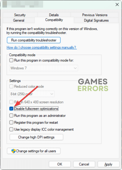 - Kattintson aKompatibilitásfül>Tiltsa le a teljes képernyő optimalizálását-