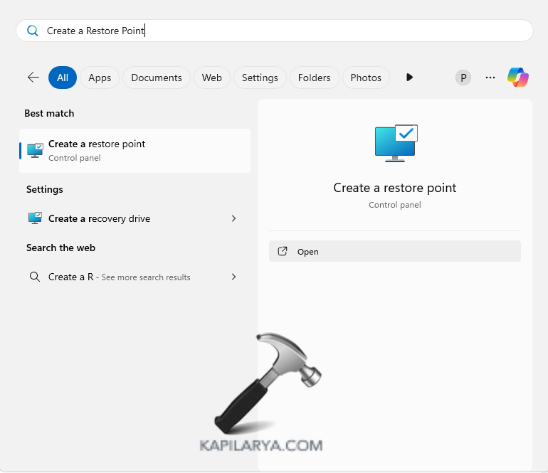 1. lépés-Először látogasson el a Start menübe, és keresse meg a Restore Point létrehozását. Válassza ki az első eredményt.