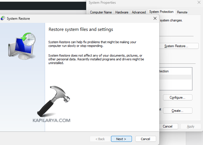 2. lépés-Ezután keresse meg a Rendszervédelem> Rendszer -visszaállítás> Következő lehetőséget.