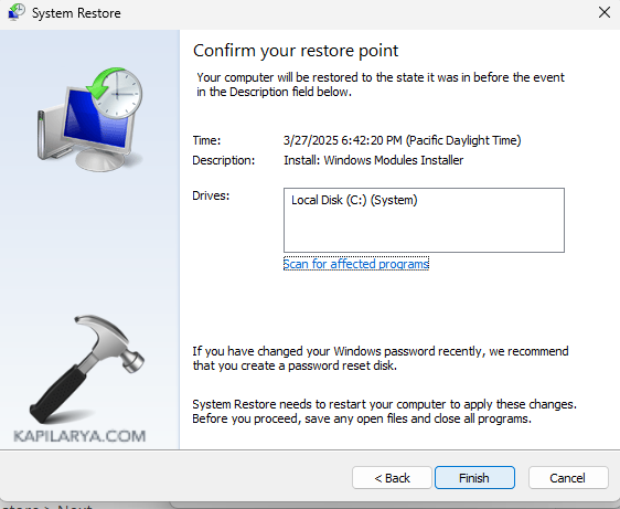 A System Restore segít a PC -hez egy korábbi létrehozott ponthoz való visszaállításban, mielőtt egy probléma megjelenése lenne. A PC előző pontra történő visszaállításának lépései a következők: