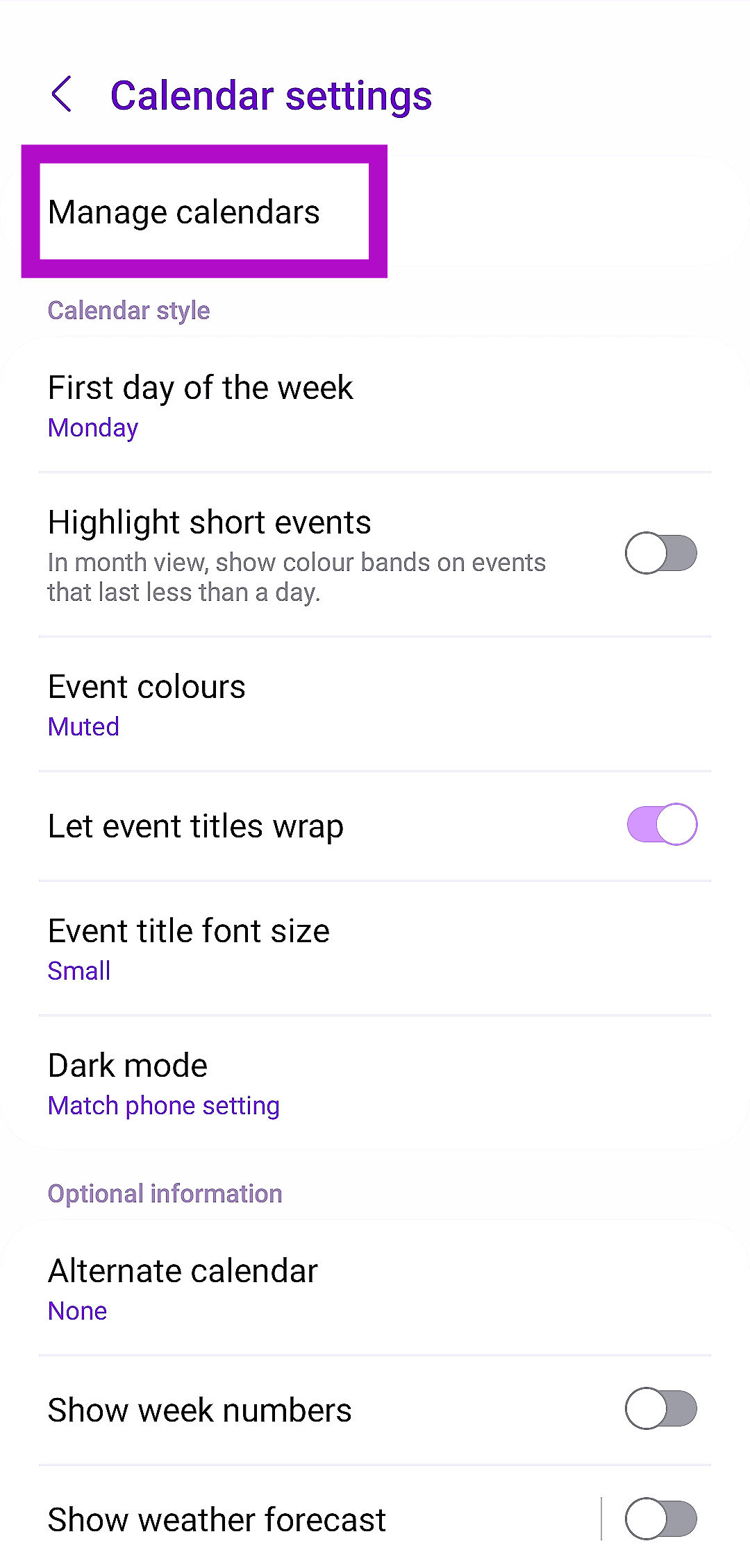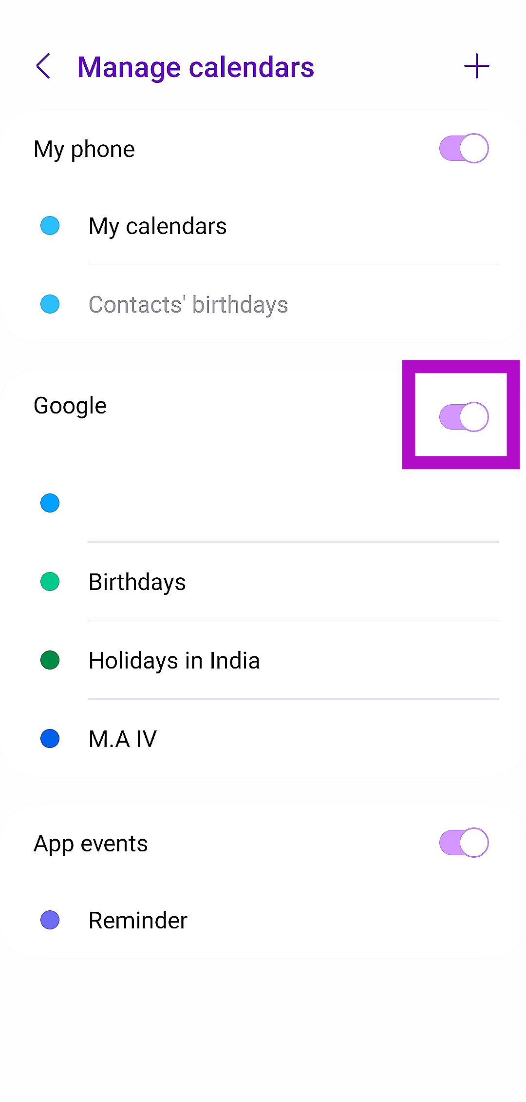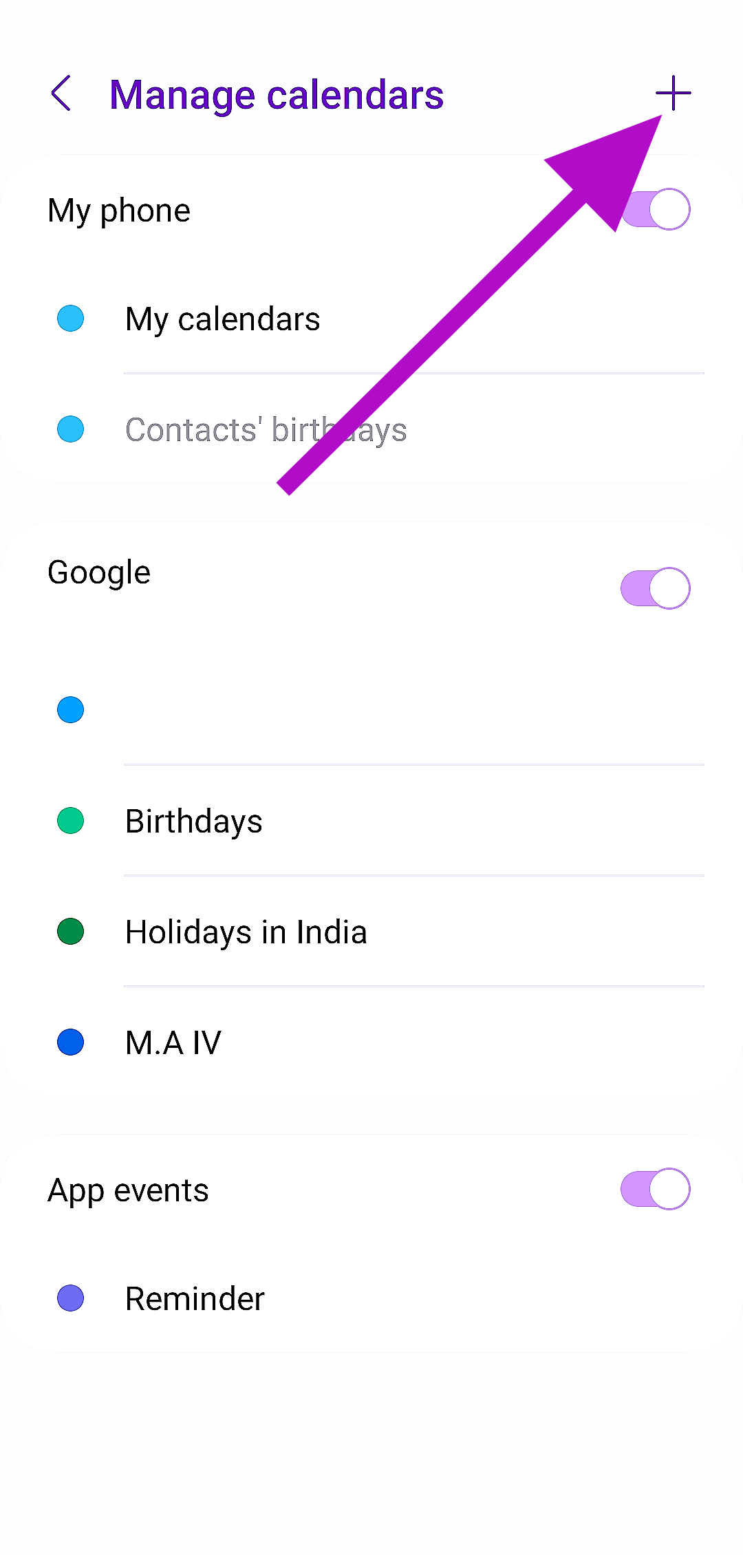 Ha több Google -fiókot használ, akkor előfordulhat, hogy elfelejtette hozzáadni a Samsung natív naptár alkalmazásában a keresett naptárt. Új naptár hozzáadásához lépjen beMenü> Beállítások> Naptárak kezelése> Plusz ikonés jelentkezzen be a Google -fiók használatával.