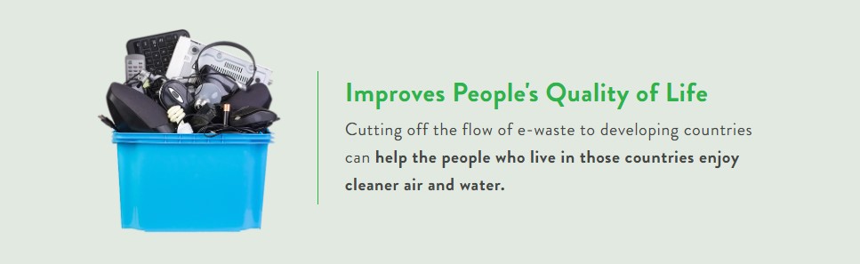 S-jätteiden virtauksen katkaiseminen kehitysmaihin voi auttaa näissä maissa asuvia ihmisiä nauttimaan puhtaammasta ilmasta ja vedestä. Turvallisempien tapojen esittely e-jätteiden käsittelemiseksi maihin, joissa myrkylliset kaatopaikat ovat ongelma, voi auttaa parantamaan lähellä olevien tai asuvien ihmisten elämänlaatua.