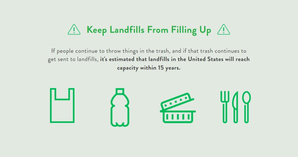 Jos ihmiset jatkavat asioiden heittämistä roskakoriin ja jos kyseinen roskakori lähetetään edelleen kaatopaikoille, on arvioitu, että Yhdysvaltojen kaatopaikat saavuttavat kapasiteetin 15 vuoden kuluessa.