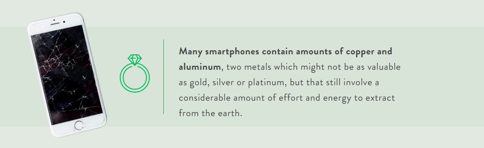 Vaikka elektroniset laitteet eivät ole täsmälleen kuin hienoja, kalliita koruja, ne sisältävät paljon jalometalleja, joita et halua mennä hukkaan. IPhonella on usein noin0,034 grammaa kultaa, 0,34 grammaa hopeaa ja pienempiä määriä platina- ja palladiumia. Monet älypuhelimet sisältävät myös suurempia määriä kuparia ja alumiinia, kaksi metallia, jotka eivät ehkä ole yhtä arvokkaita kuin kulta, hopea tai platina, mutta johon sisältyy silti huomattava määrä ponnistelua ja energiaa saadakseen maasta.