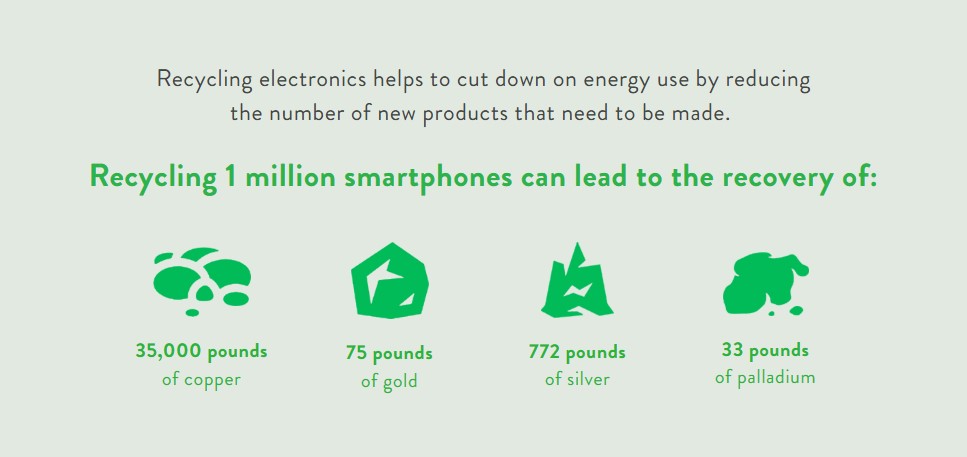 Kun kierrät älypuhelinta, on usein mahdollista palauttaa puhelimessa käytetyt jalometallit ja antaa heille uusi elämä vähentämällä tarvetta käyttää energiaa ja aikaa louhinta ja metallien käsittely maasta.Kierrättää miljoona älypuhelintavoi johtaa:
