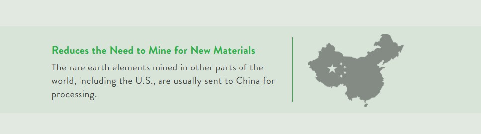 Yksi tapa vähentää kaivoksen tarvetta harvinaisten maametalleille on kierrätyslaitteet, jotka sisältävät elementit jo. Rippulointi auttaa vähentämään laitteita uusille kuluttajille tai jaetaan ja myydään osille, ja se auttaa vähentämään Amerikan riippuvuutta tuoduihin harvinaisten maametallien metalleihin ja minimoimaan tarpeen kaivoa ja käsitellä lisäelementtejä.