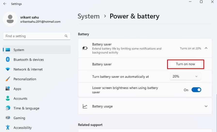 - Siirry valitse järjestelmä ja sitten Power & Battery ja laajenna akku -osa