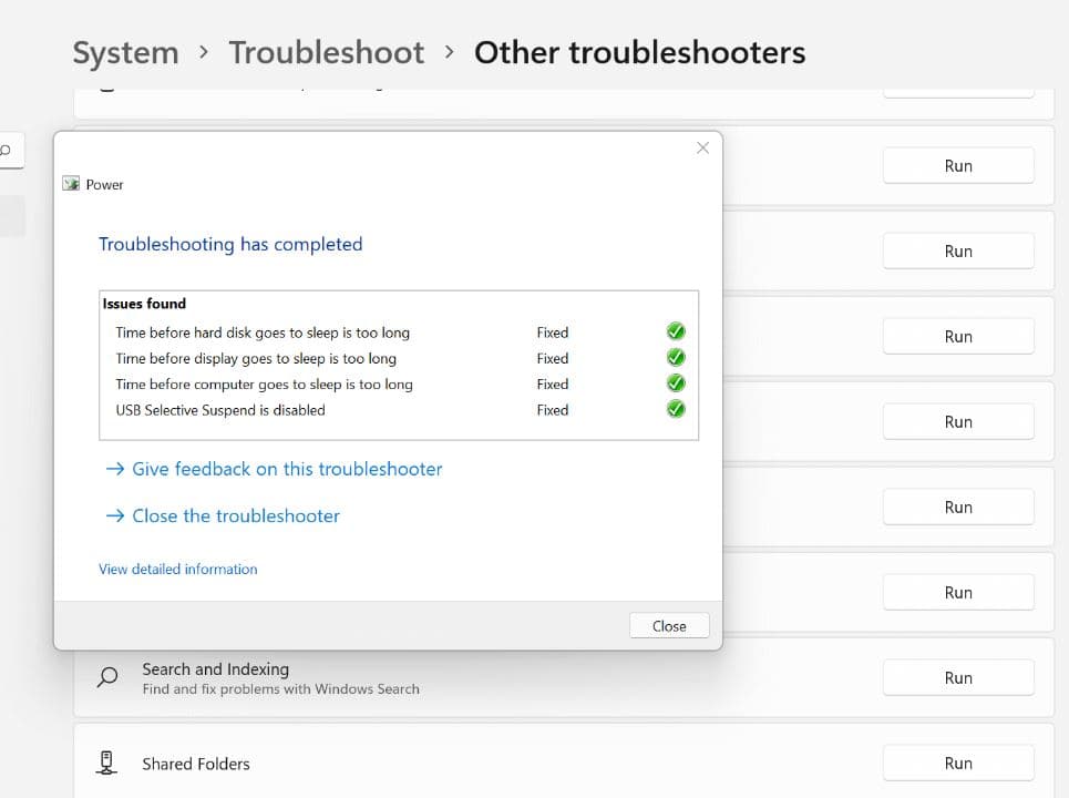 Suorita myös sisäänrakennettu virran vianmääritys, joka pystyy havaitsemaan ja korjaamaan virranasetuksiin ja virranhallintaan liittyvät ongelmat ja parantaa akun käyttöikää Windows 11 -kannettavassa tietokoneessa.