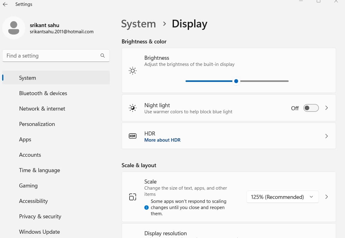 - Siirrä järjestelmässä sitten näyttöön ja käytä liukusäädintä kirkkauden ja värin alla säätääksesi näytön kirkkautta.