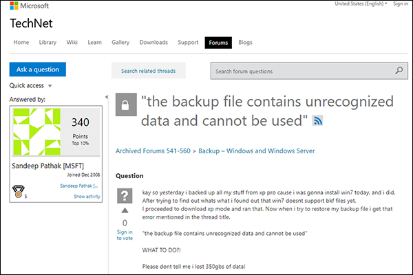 - Kun asiakkaat yrittävät palauttaa Windows XP: llä tai Server 2003: lla luotuja varmuuskopiotietoja käyttämällä Windows 7: n, 8: n tai 10: n NTBackup -sovellusta, ilmestyy virhevaroitus.