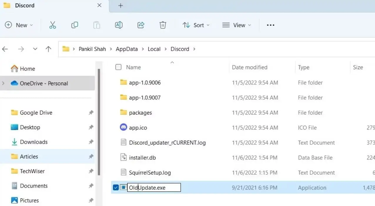 - Siirry Discord-kansioon, etsi update.exe-kansio ja nimeä se uudelleen nimellä oldupdate.exe