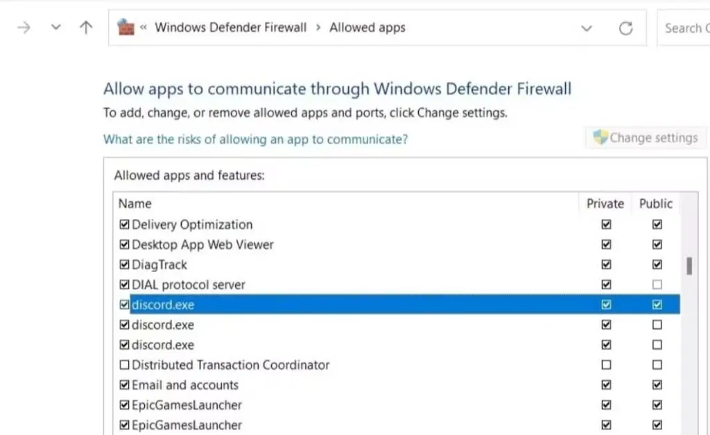 - Napsauta Muuta asetuksia ja etsi sitten luettelosta Discord ja merkitse valintaruudut, joissa lukee Yksityinen ja Julkinen.