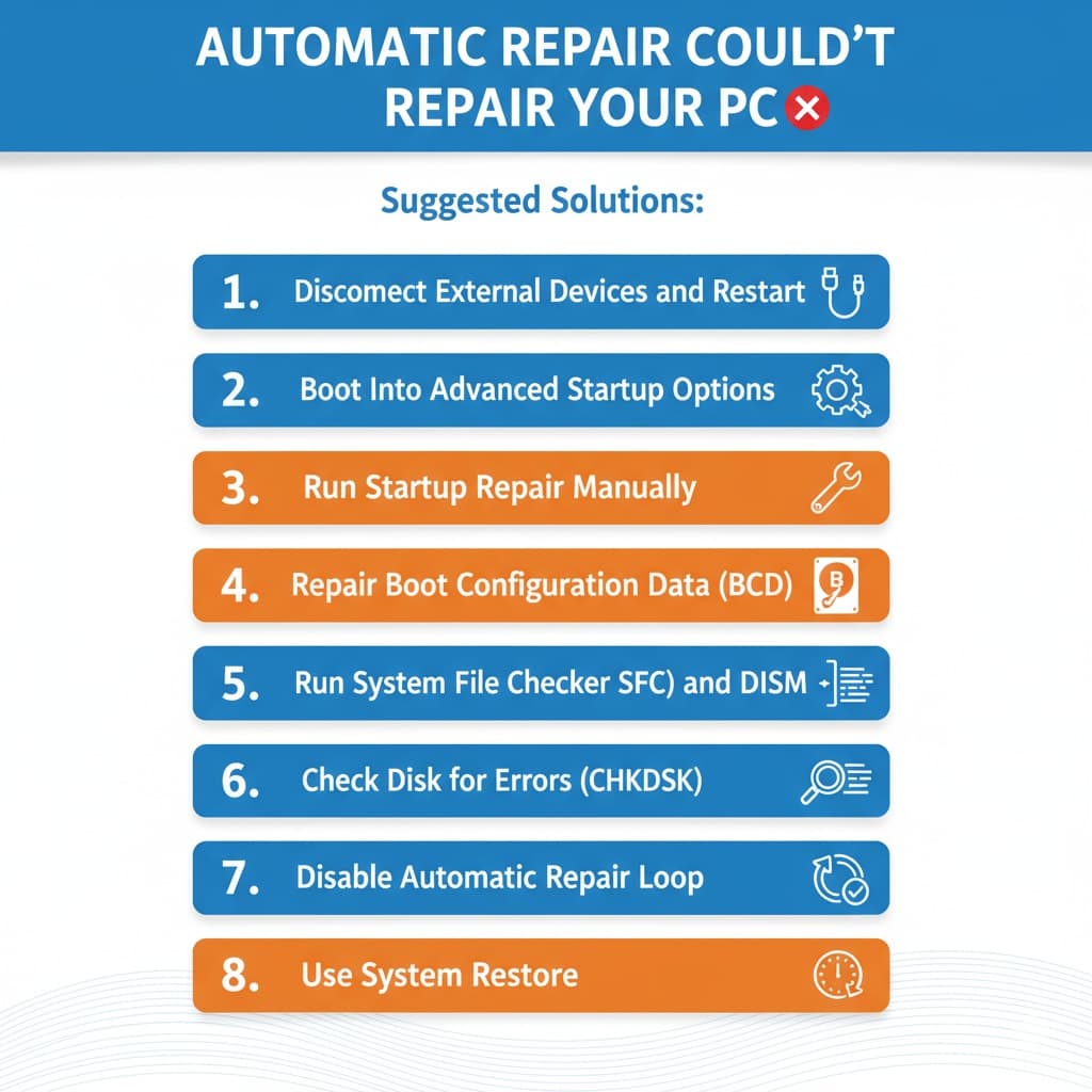 Tämä virhe tarkoittaa, että Windows yritti korjata käynnistysongelman, mutta ei löytänyt tai korjaa taustalla olevaa syytä.