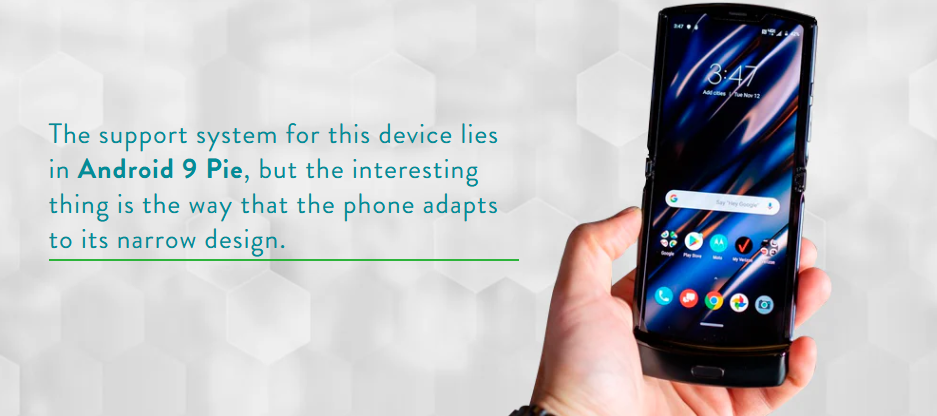 Yleisten käyttöä koskevien mukautusten lisäksi Motorola Flip -puhelimessa on kaikki yksityiskohdat, joita odotimme nykyaikaiselta älypuhelimelta. Se toimii Googlepayn, Bluetooth -laitteiden, GPS: n, LTE -verkkojen ja muun kanssa. Lisäksi tämä razr on vedenkestävä.