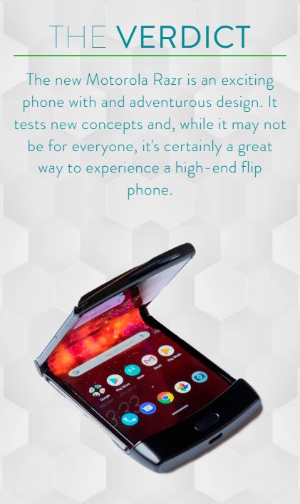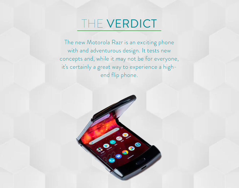 - Näytön suunnittelu: Ilman samoja ongelmia kuin monet muut taitettavat puhelimet, Razr erottuu luotettavammasta vaihtoehdosta. Lisäksi, kun se on taitettu ja lähes määritellyt rypytys, se ylittää näkökohdat, joita monet valmistajat edelleen työskentelevät.