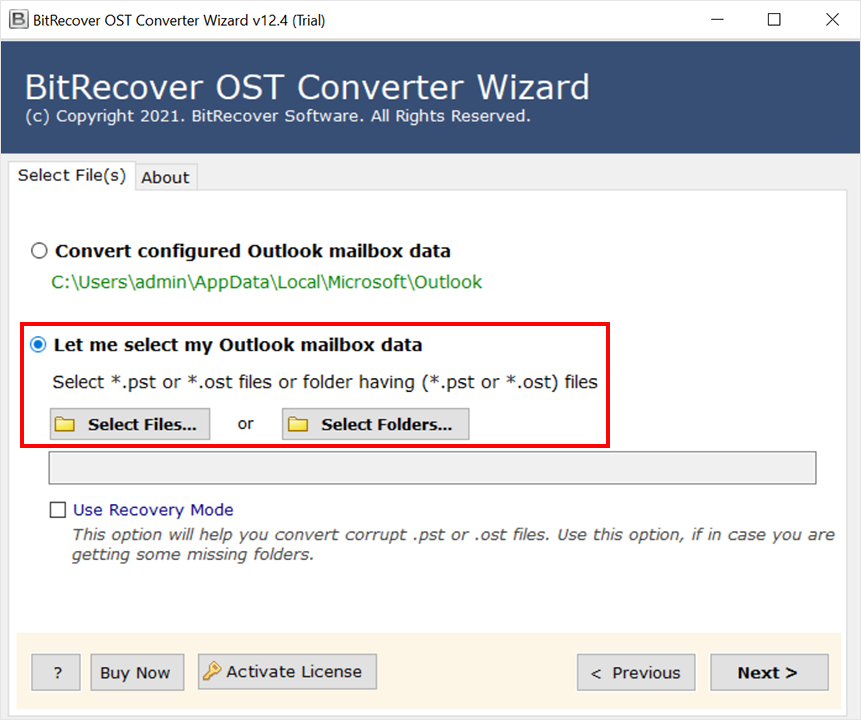 - Lataamisen ja asentamisen jälkeen suorita työkalu ja napsautaValitse tiedostot…taiValitse kansiot…Vaihtoehto valita OST -tiedostot tietokoneelta.
