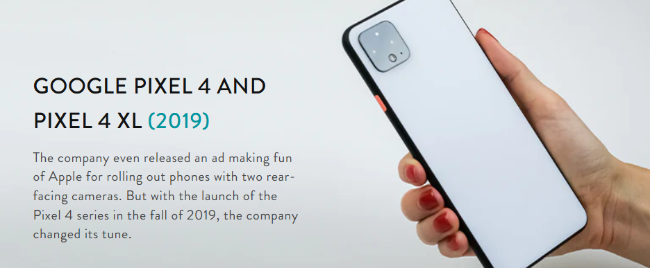 Google otti hitaasti käyttöön suuntauksen lisätä kaksi pääkameraa. Yhtiö julkaisi jopa Applen hauskanpitoa puhelimien käyttöönotosta kahdella taaksepäin suuntautuvalla kameralla. Mutta kun Pixel 4 -sarja lanseerattiin syksyllä 2019, yritys muutti sävelmäänsä.