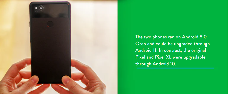 Kaksi puhelinta juoksi Android 8.0 Oreolla ja ne voitiin päivittää Android 11: n läpi. Sitä vastoin alkuperäinen pikseli ja Pixel XL olivat päivitettävissä Android 10: n kautta. Pixel 2: n perusmallissa oli kaksinkertainen alkuperäisen mallin säilytystila, 64 Gt 32 Gt: n sijasta. Tämä tarkoittaa, että voit tallentaa kaksinkertaisen musiikin, valokuvat ja sovellukset Pixel 2: lla.