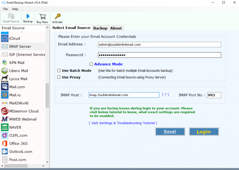 Siirry nyt sähköpostilähteen luetteloon ja valitse siitä IMAP -palvelin. Tämä aloittaa äkillisen linkin prosessinIMAP -sähköpostin varmuuskopiointiOutlook -tilille.