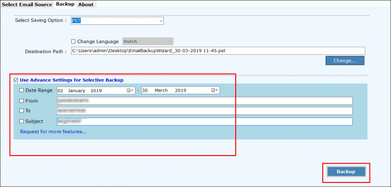 Viimeiseksi napsautavarmuuskopiopainike. Tämä aloittaa äkillisten linkkien sähköpostien varmuuskopion Outlookiin. Pian saat muuntamisen valmistuneen viestin.