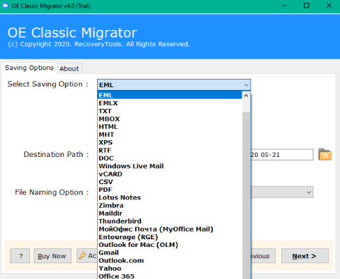 Sen jälkeen,valitse EML-vaihtoehtoGUI:n useista tiedostojen tallennusvaihtoehdoista.