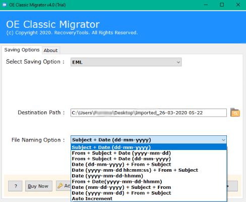 Käyttäjäystävällinen tallennuspolku:Tällä työkalulla voit tallentaa OE Classic -sähköpostien, osoitekirjan ja liitteiden varmuuskopion haluamaasi kohteeseen.