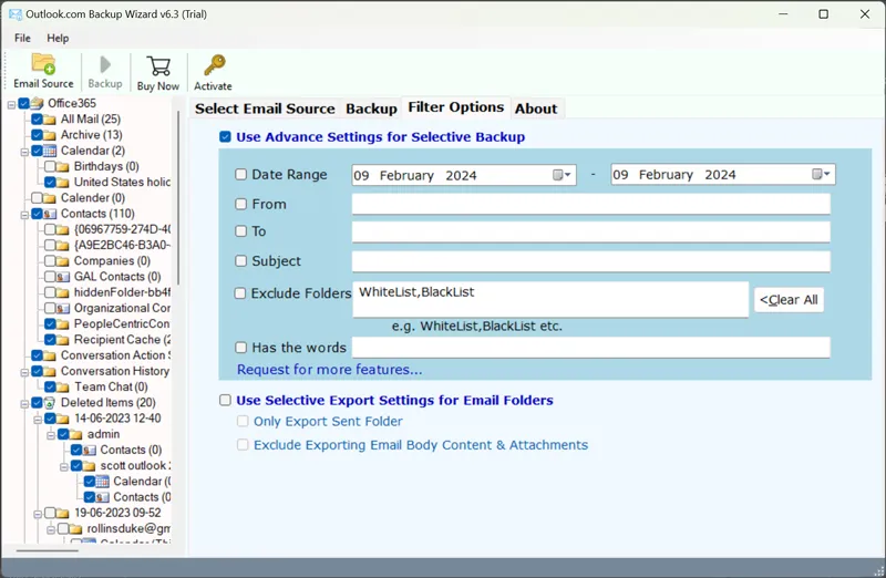 2. Siirrä valikoivat sähköpostit hotmailista mbox -tiedostoihin -Ohjelmisto tarjoaa käyttäjille edistyneen asetuksen selektiiviselle varmuuskopiotilalle, kun olet valinnut MBOX -tiedoston tallennustyypiksi. Se tarjoaa useita suodattimia, kuten päivämäärää, -, jollei siirretään valikoiva hotmail -sähköposti Mbox -muotoon.
