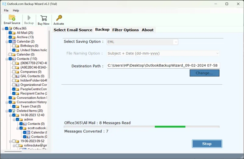 7. Viimeistely, Hotmail -MOX -vientiprosessi napsauttamallaVarmuuskopiopainike. Odota, kun muuntamisprosessi on käynnissä.