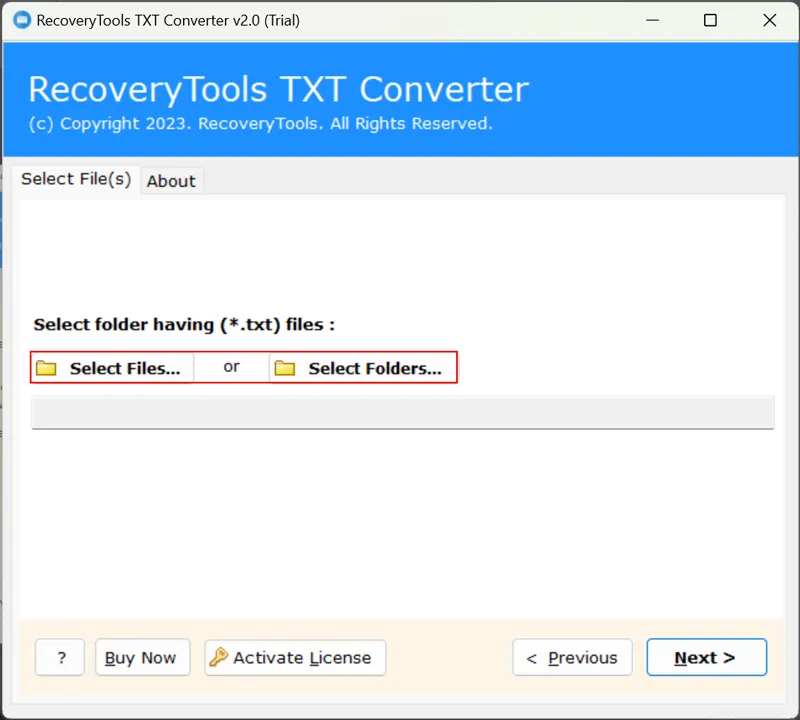 Vaihe 2.NapsauttaaValitse tiedostottaiValitse kansioVaihtoehto lisätä TXT -tiedostoja ohjelmistoliittymään.