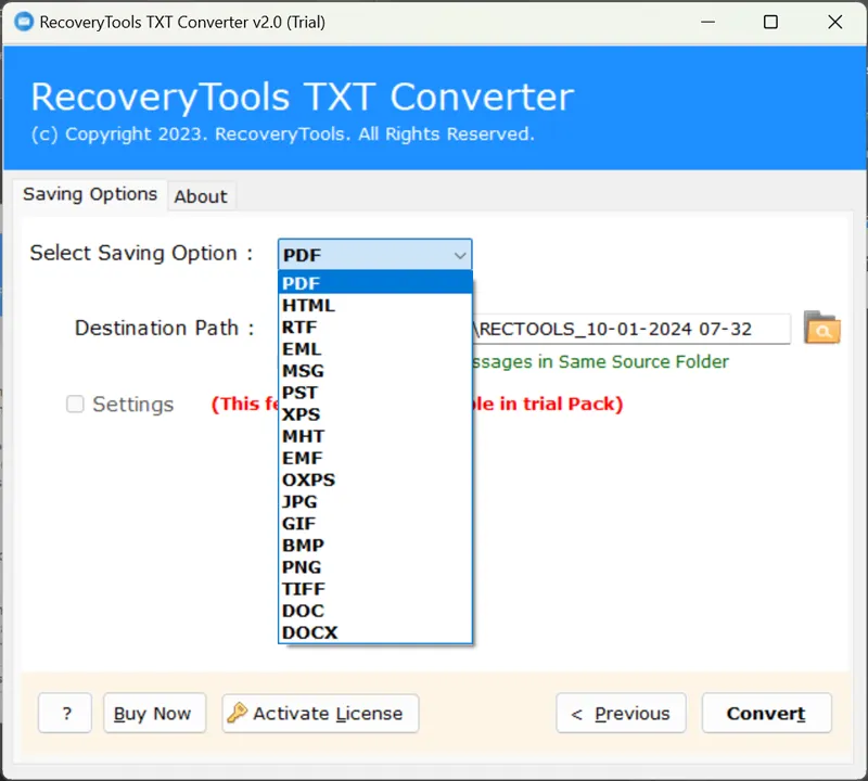 SeEnsimmäinenTXT: lle PST -muunnin antaa käyttäjille mahdollisuuden muuntaa suurimman osan TXT -tiedostoista PST: ksi. Tämän sovelluksen erikoisuus on, sevoi muuntaa monen tyyppisiä tekstiasiakirjoja, onko kyse HTML: stä, MHT: stä, TXT: ssä, RTF: ssä, PDF: ssä, XPS: ssä, DOC: ssä, DOCX: iin kaikkiin uusimpiin ja vanhaan Outlook -versioon.ToinenTxt to PST -muunnin on myös erityisen rakennettu tekstin muuntamiseksi PST: ksi, mutta onPystyy muuntamaan suurimman osan tekstitiedostosta paitsi PST: ksi myös useiksi muiksi tiedostomuodoiksi, kuten PDF, RTF, EML, MSG, XPS, MHT, EMF, OXPS, JPG, GIF, BMP, PNG, jne..