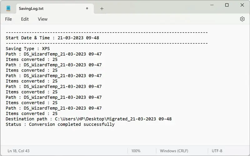 - Työkalu tuottaa ja avaa a automaattisesti alokiraporttitiedostoTietoja muunnetusta tiedoista.