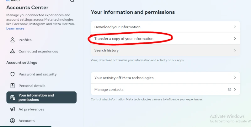 - Sen jälkeen napsauta"Tietosi ja käyttöoikeutesi"Napauta sitten"Siirrä kopio tiedoistasi".