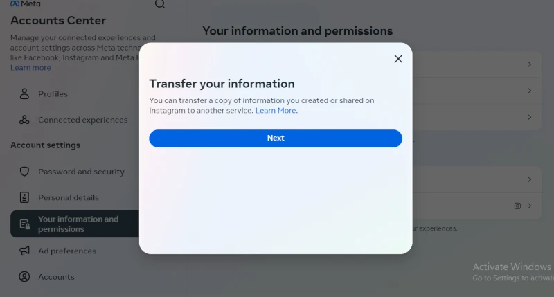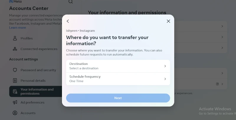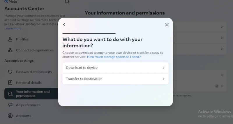 - Päätä, haluatko"Lataa Instagram -tiedot laitteeseesi"tai"Siirrä ne määränpäähän".