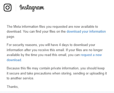Lisäksi sähköpostin saaminen latauslinkillä voi kestää jopa 30 päivää. Heti kun saat sen, lataa se toimitetusta linkistä ja pidä se koneellasi. Tämä voidaan ladata, jos Instagram -tietojen tallennus on yleensä noin 2,5 Gt, vaikka se voi vaihdella valittujen tiedostojen laadun ja tyyppien mukaan. Mutta ota tämä varovaisuus, kun Instagram lähettää sinulle sähköpostia, voit ladata Instagram -tilitiedot vain 4 päivän ajan.