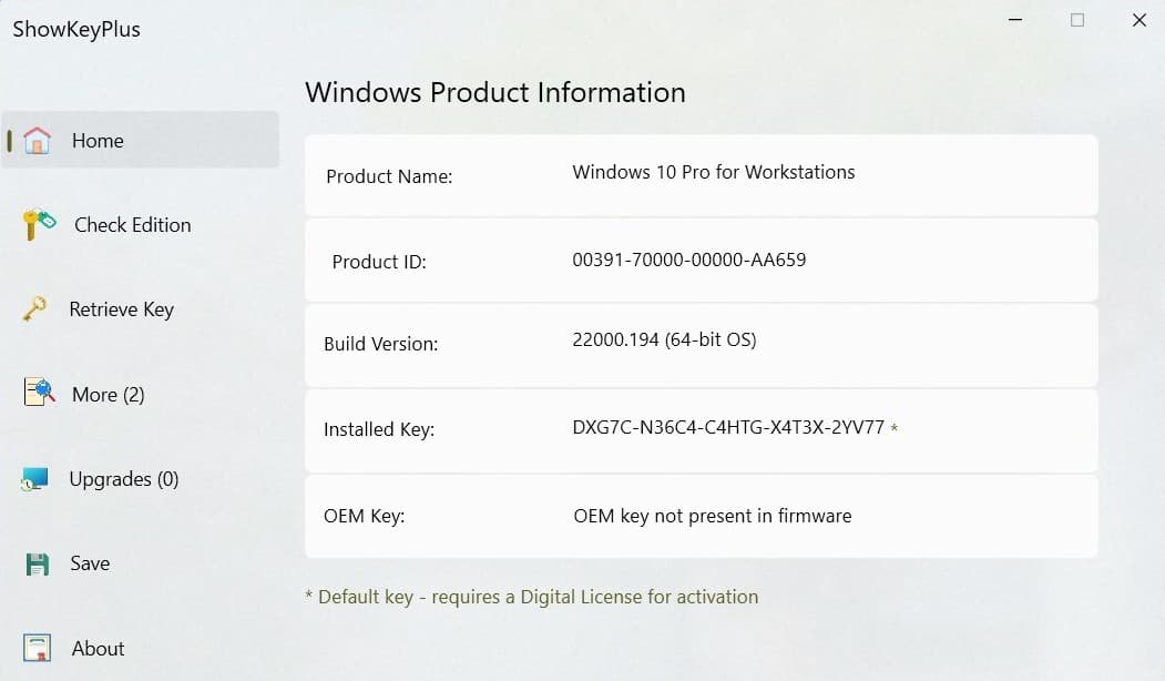 - ShowKeyPlus— avoimen lähdekoodin, näyttää asennetut ja OEM-avaimet ja voi purkaa digitaalisen tuotetunnuksen.