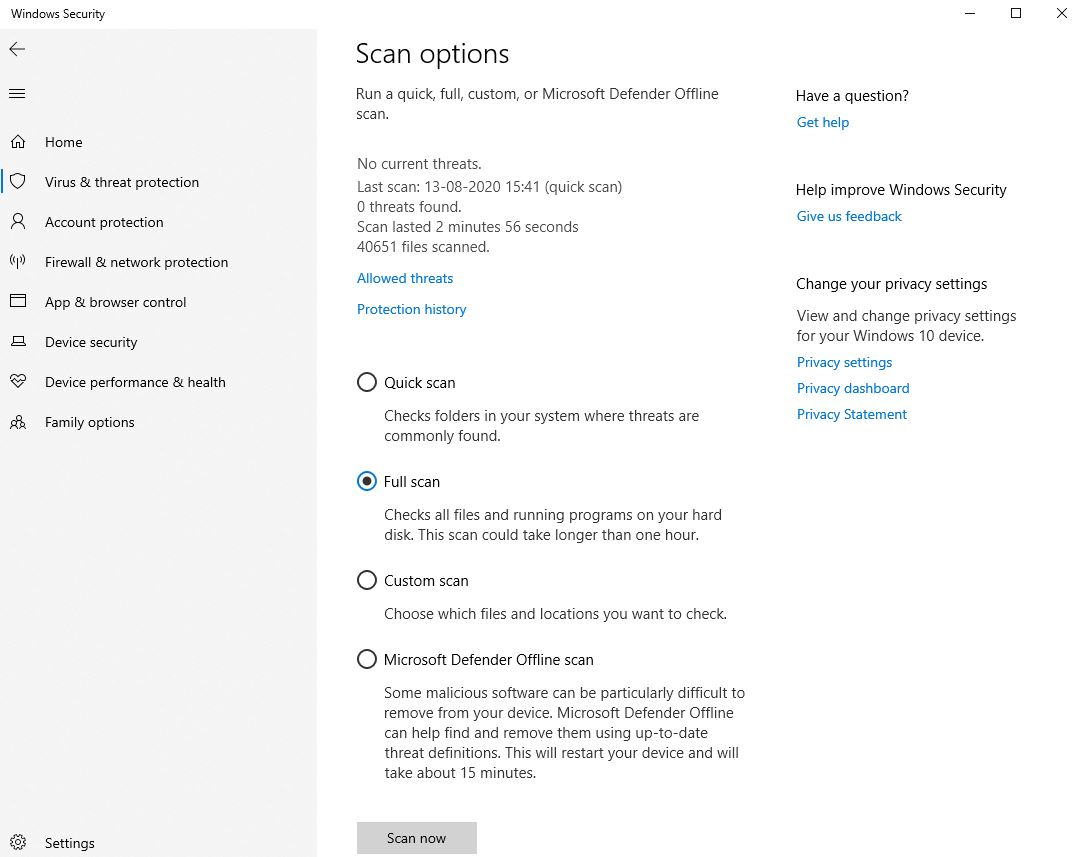 Voit suorittaa täyden järjestelmän tarkistuksen Windowsin suojauksen (Defender) tai kolmannen osapuolen avullavirustorjuntaohjelmisto havaita ja poistaa haittaohjelmatartunnat, jotka voivat aiheuttaa Bad Image -virheen.