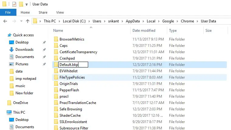 Jos saat huonon kuvan virhetilan 0xc000012f, kun avaat Google Chrome -selaimen. avaa C:UsersUsernameAppDataLocalGoogleChrome User Data. Etsi sitten Default-kansio ja nimeä se uudelleen nimellä Default.bkp.