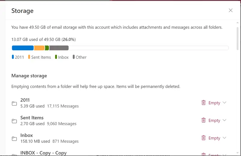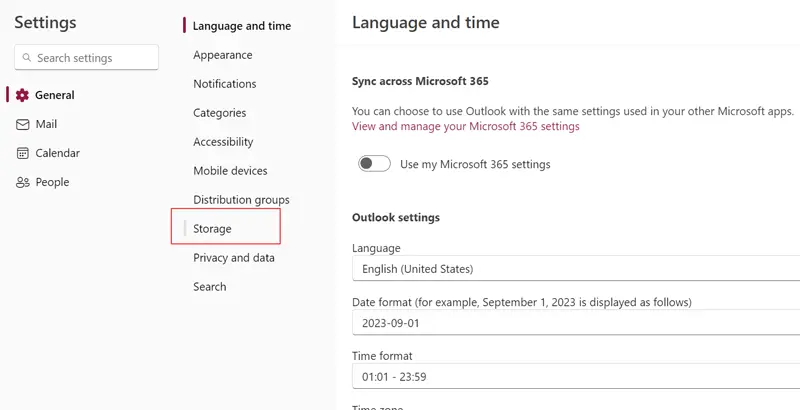 - Katso nyt käytettävissä oleva ja käytetty tallennustilaOutlook 365postilaatikko.