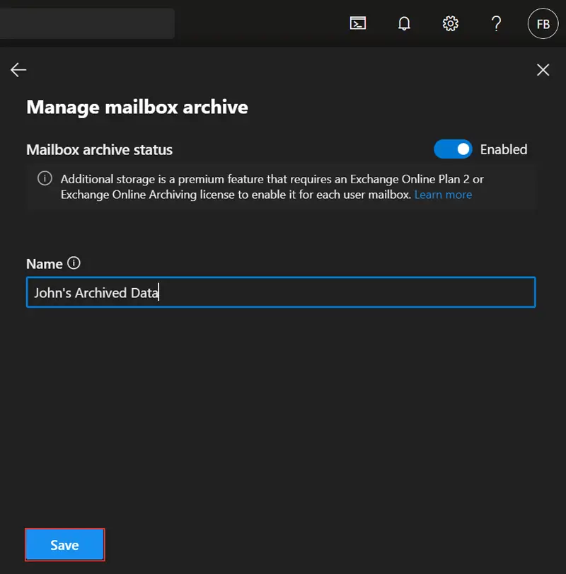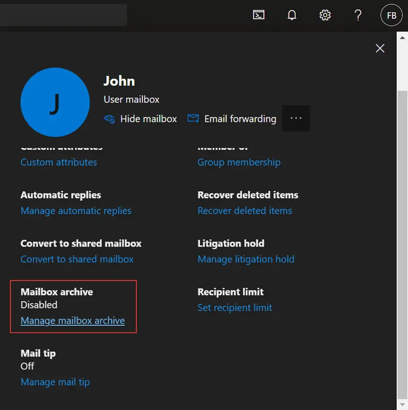 #3 -menetelmä: Ota paikan sisäinen arkisto laajentaa Office 365-postilaatikon kokoa