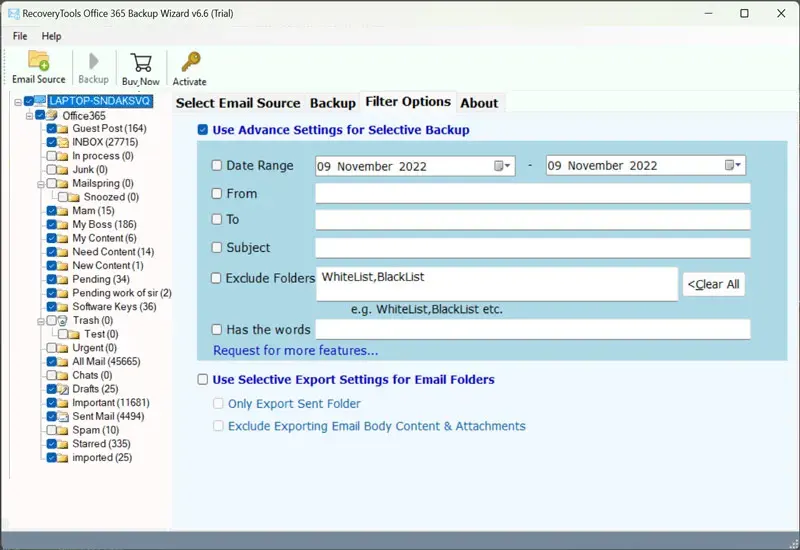 Paras Office 365 Backup -työkaluon saatavana Windows- ja Mac OS -käyttäjille ja antaa heidän viedä Office 365 -postilaatikko PST: lle, MSG: lle, EML: lle, MBOX: lle, PDF: lle, DOC: lle jne. Joten voit käyttää tätä ohjelmistoa ladataksesi Old Office 365 -sähköpostit paikallisesti ja tallentaa ne tulevaa käyttöä varten. Tämä ohjelmisto on hyödyllinen kasvattamaan Office 365 -postilaatikon kokoa 100 Gt: iin, koska se voi ladata vanhat sähköpostit päivämäärän suodattimen mukaan. Myöhemmin voit poistaa vanhat sähköpostit laajentaaksesi Office 365 -postilaatikon kokorajaa.