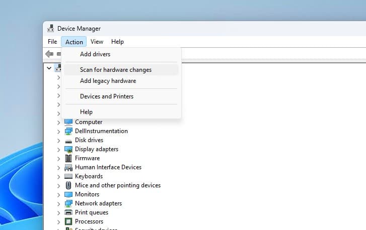 Avaa Laitehallinta uudelleen napsauttamalla Toiminto ja etsi sitten laitteistomuutoksia.