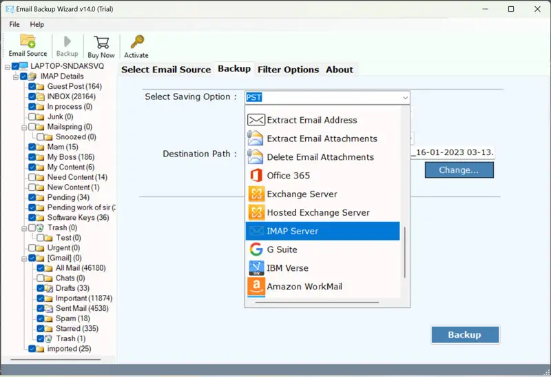 - Valitse Selection -vaihtoehto -painikkeestaIMAP -palvelinvaihtoehto.