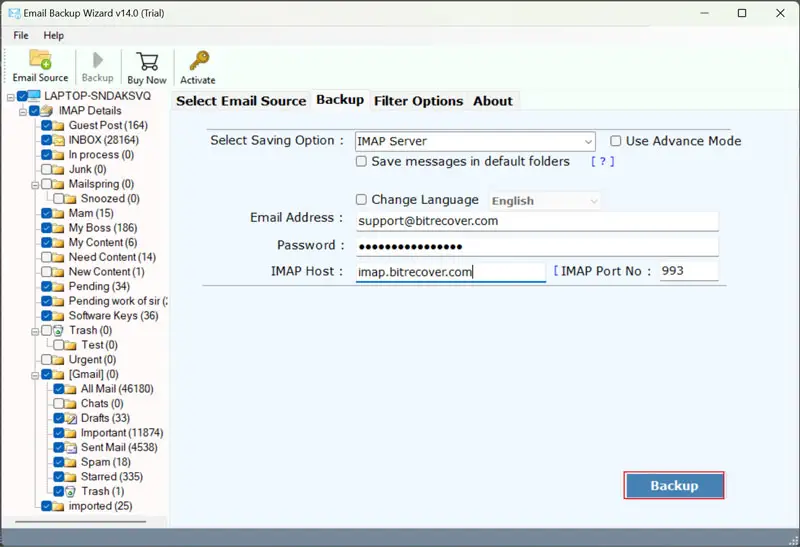 - Advanced Filter -vaihtoehdon avulla käyttäjät voivat siirtää tiettyjä sähköposteja päivämääräalueen, aiheesta jne. Kautta. Voit myös sulkea pois ei -toivotut kansiot ja