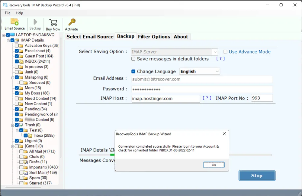 - Täytä Kerio Server IMAP -tiedot tietyillä kentällä ja napsautaVarmuuskopiopainike.
