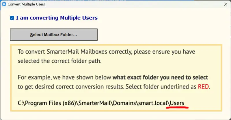 V:Käynnistä ohjelmisto ja valitse ”Muunna useita käyttäjiä” -vaihtoehtoa. Valitse sitten kansio, jolla on useita SMARTERMAIL -profiileja, ja siirrä ne O365 -tilillesi.