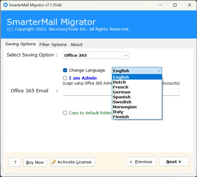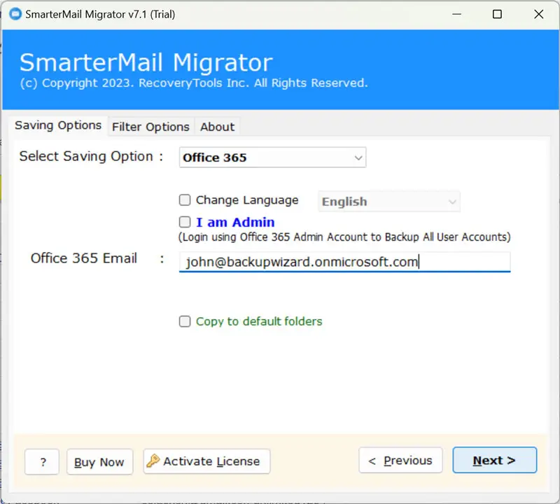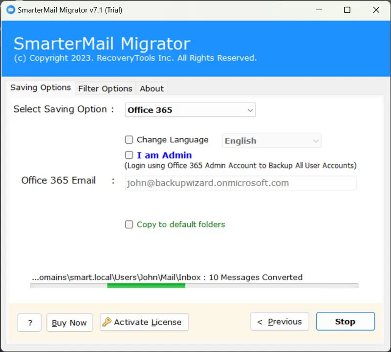 V: Kyllä,Kehittäjämme ovat lisänneet omistetun vaihtoehdon ”Kopioi oletuskansioihin”. Joten ota ensin käyttöön tämä ominaisuus ja aloita sitten Smartermail Microsoft 365 -siirtoon.