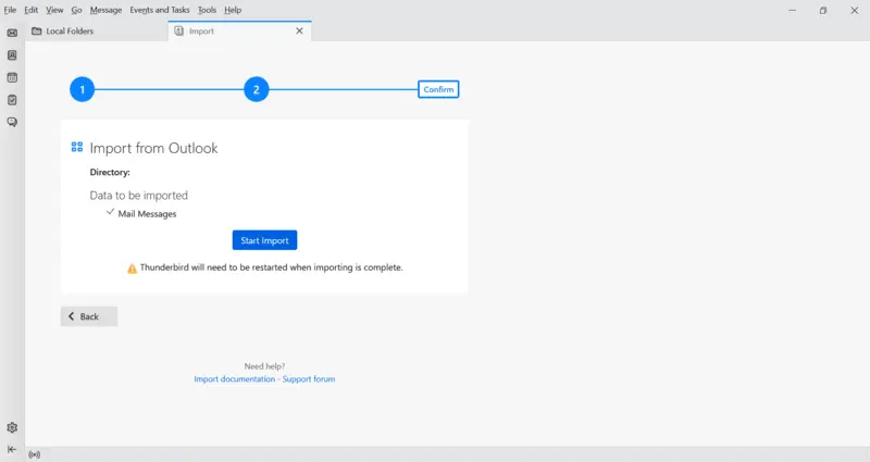 - PainaAloita tuonti-painiketta tuodaksesi OST:n Thunderbirdiin.