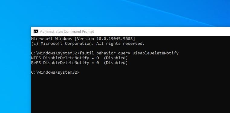 Komennon suorittamisen jälkeen sinun pitäisi saada seuraustanolla (0),Se tarkoittaa, että TRIM on käytössä.